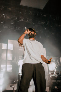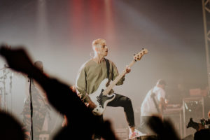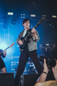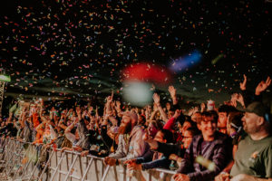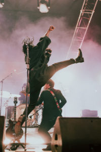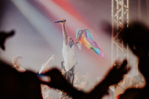 Cependant, pas une minute à perdre, Skip The Use a déjà commencé leur show. Certains festivaliers n’ont pas su faire un choix entre les nordistes et la fanfare. Ils se voient alors obligés de courir en essayant, tant bien que mal, de se frayer un chemin parmi une foule de plus en plus dense. Heureusement pour les retardataires, le groupe a commencé son set par ses derniers morceaux et termine par leurs plus grands classiques. A l’effigie du chanteur en salopette à motif qui saute partout sur scène, le public est en folie lorsque l’artiste interprète Ghost, drapeau LGBT+ autour du cou. Enfin, après avoir crié “Skip the Fucking Use”, le groupe descend dans la foule pour interpréter leur dernier morceau, Bastard song. Le public se bouscule et se presse pour se rapprocher au plus près du chanteur et de deux musiciens.