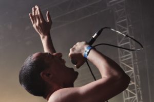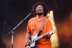 Rembobinage. A 21h, quand le concert de BEAK> s’apprête à commencer, le super stand disquaire des Balades Sonores présent sur le site depuis le début du festival organise une signature de vinyles. C’est WU-LU la star du moment. Il vient de terminer son concert sur la scène des remparts qui a débuté vers 20h. Son album Loggerhead fait pas mal entendre parler de lui en ce moment. Nous l’aimons personnellement beaucoup, même si nous avons un peu de mal à revenir dessus régulièrement. Probablement à cause de morceaux pour le moins intriguants et bizarrement construits. En terme de production, WU-LU a mis le paquet. Les bases rythmiques sont au centre. Et la guitare, primordiale. Dans un rap – soul – rock, c’est un cocktail détonant, surtout sur certains morceaux coups de poings comme « Times » et « South ». Son concert à la Route du Rock attise la curiosité du public. Il y a du monde devant la petite scène. Le musicien est accompagné de deux autres gars, à la basse et à la batterie. Le concert a d’abord un peu de mal à prendre. Les morceaux joués ne sont pas forcément les plus entrainants. Mais l’attitude du chanteur, détachée, a de quoi nous tenir en haleine. La dégaine est simple : t-shirt orange de monsieur tout le monde. Comme si un gars du public était monté sur scène. Mais là-haut, il assure tout en modestie. Sa présence ne trompe pas. Accompagné de sa guitare qu’il tient désinvoltement, WU-LU nous transporte finalement dans un paysage musical original, intense et incarné. Le final sur « South » en sera la meilleure preuve, avec des cris venus tout droit des enfers.