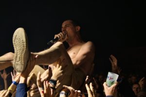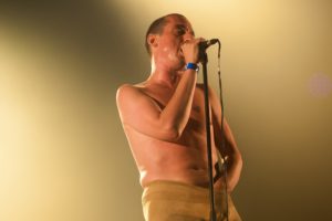 A leur arrivée sur scène, à six, on s’étonne déjà de l’atmosphère mystérieuse et pleine de tension dans laquelle ils plongent le festival. Le leader, tel qu’on le connait, arrive torse nu, seulement vêtu d’un short moulant de la même teinte que sa peau. C’est un sacré personnage, on a été prévenu. Il est d’abord droit comme un piquet. Le groupe débute d’inquiétantes expérimentations sonores. Très vite, Lias Saoudi saute dans le public. Pas sur mais dedans. Alors, le show peut commencer. Il court, se fraye un chemin, pousse des cris, se met au sol, provoque le public, s’agrippe à lui, comme un fou qui a perdu sa direction : « i wanna go hoooome ». Tout le monde sait que ça fait partie de la performance, et tente alors de jouer avec lui, de le toucher, de le cogner même parfois. Persiste toutefois chez chacun ce sentiment de panique et d’incompréhension, qui fait monter l’adrénaline. Ce début de concert est une plongée dans les entrailles, qui fait office de mise en condition. Cela va être éprouvant. Le leader remonte enfin sur scène après s’être fait malmené. Débute alors les morceaux plus classiques, mais non moins intenses. « Wet Hot Beef » ouvre le bal, issu du premier album. C’est direct, puissant, aidé par un son majestueux. On commence à avoir l’habitude de la scène du Fort, bientôt on ne voudra plus la quitter du tout. Le concert se poursuit dans la même hallucination sonore. Sur scène, les morceaux de FAT WHITE FAMILY gagnent en tout. Lias Saoudi les transporte assurément dans une autre dimension, mais c’est aussi grâce aux musiciens qui, derrière leur dégaine bien britanniques, assurent de leur donner l’ampleur méritée. L’affranchissement par rapport aux versions studios est totale. C’est tellement rare qu’il est bon de le souligner.