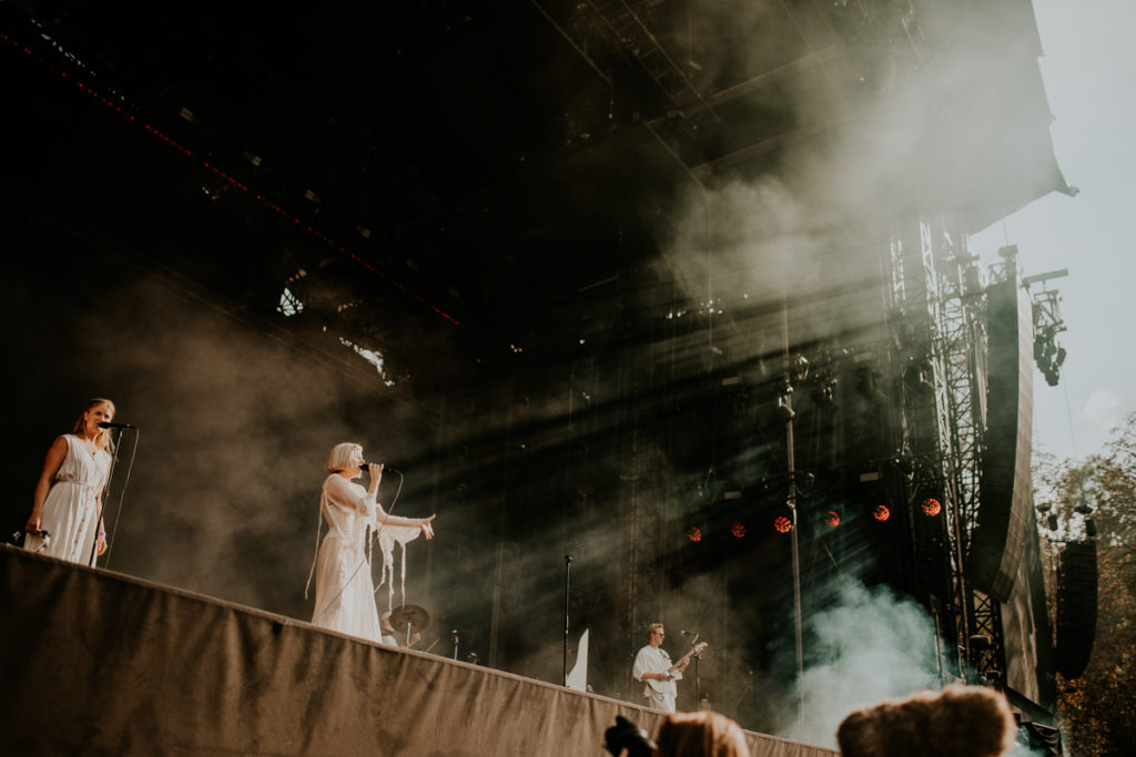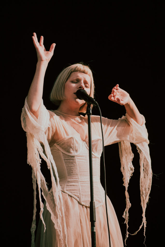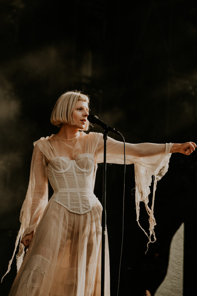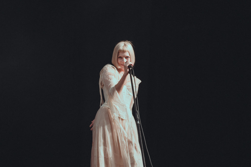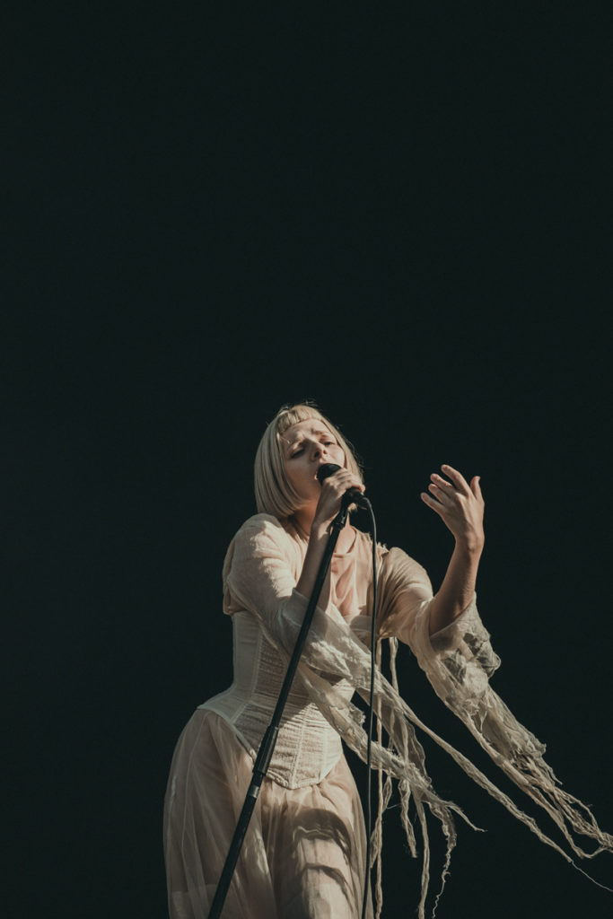 En milieu d’après-midi, une présence bien particulière vient éveiller les esprits. La tornade Aurora est là et compte toucher de ses doigts de fée une audience forcément conquise. Il faut dire que la jeune chanteuse vêtue d’une longue robe blanche, telle la prêtresse qu’elle est, sait diffuser sa bienveillance. Il y a une générosité sans limite dans le show de la musicienne. Venue défendre sa très jolie dernière pépite en date « The God We can touch », elle semble être surexcitée. Debout sur la Grande Scène, la voilà qui explique donc avoir joué sur une scène bine plus petite lors de sa dernière venue. Intimidée, elle expose pourtant de joie « Je suis très bien là finalement ». Il y a une sincérité à fleur de peau dans les gestuelles de la musicienne, une candeur innée qui rassemble et frappe fort. Elle va toucher les cœurs au delà de sa voix gracieuse qui prend encore plus de nuances en live.