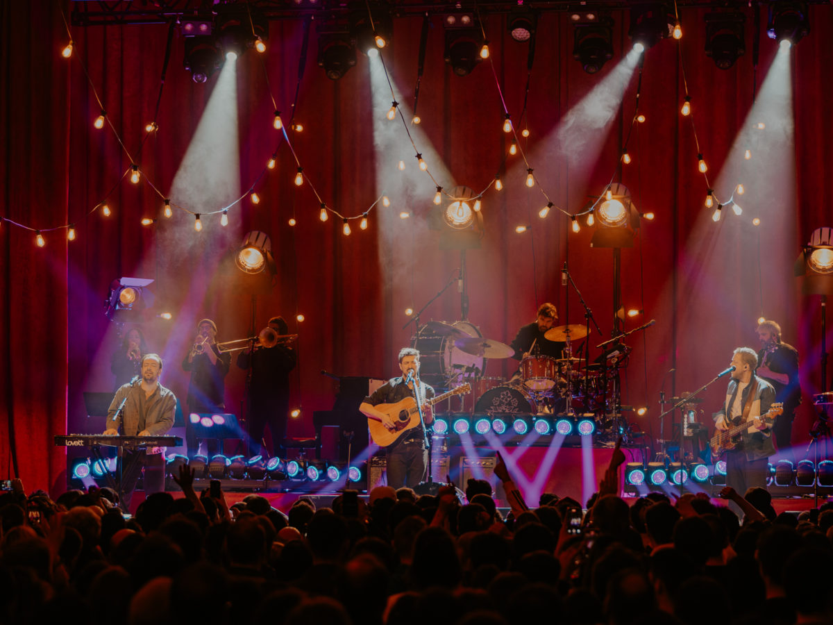 Voilà quelque jours que le temps piquant de l’hiver a enfin décidé de faire une trêve. En ce début du mois de mars 2025, les températures montent à 17 degrés permettant à chacun.e d’afficher une mine ravie. La misère serait bien moins pénible au soleil comme dit la chanson. Tout ça pourrait n’être que pure coïncidence, mais l’affaire parait trop grosse pour y croire. Les astres alignés laissent bien voir que le passage de Mumford & Sons dans la capitale y est pour beaucoup. La formation de Marcus Mumford vient offrir ses douceurs dans une petite salle. Une tournée des clubs de seulement 9 dates triées sur le volet, pour public convaincu et dont les places se sont toutes vendues en quelques minutes seulement. Qui dit concert à places limitées dit aussi format tout particulier. Devant la salle, certain.es sont tombées dans le piège de la revente de faux billets et essaient quand même de supplier leur entrée. Tout le monde veut sa place au soleil. Point de première partie, point d’heure tardive, un show simple et parfaitement orchestré attend les spectateurs ce soir. Pour les accueillir, un véritable décors de guinguette a été installé. Des petits lampions peuplent autant la scène que la jolie salle parisienne. Pour celles et ceux qui l’ont toujours connue, le simple fait de faire quelques pas dans l’Elysée Montmartre est synonyme de joie. Le lieu qui avait brûlé avait failli être remplacée par un parking il y a plus de 10 ans et son sauvetage, essentiel, en font un lieu qui convoque passé et présent de la plus belle des façons. Cette dualité, elle est aussi miroir de la musique de Mumford & Sons, folk rock accessible. La folk, la musique qui honore l’ancien, reprend en son origine des morceaux du patrimoine folklorique si anciens que personne n’en connait le compositeur. Le rock, ce courant qui sait toujours se renouveler et apporter son lot de modernité.