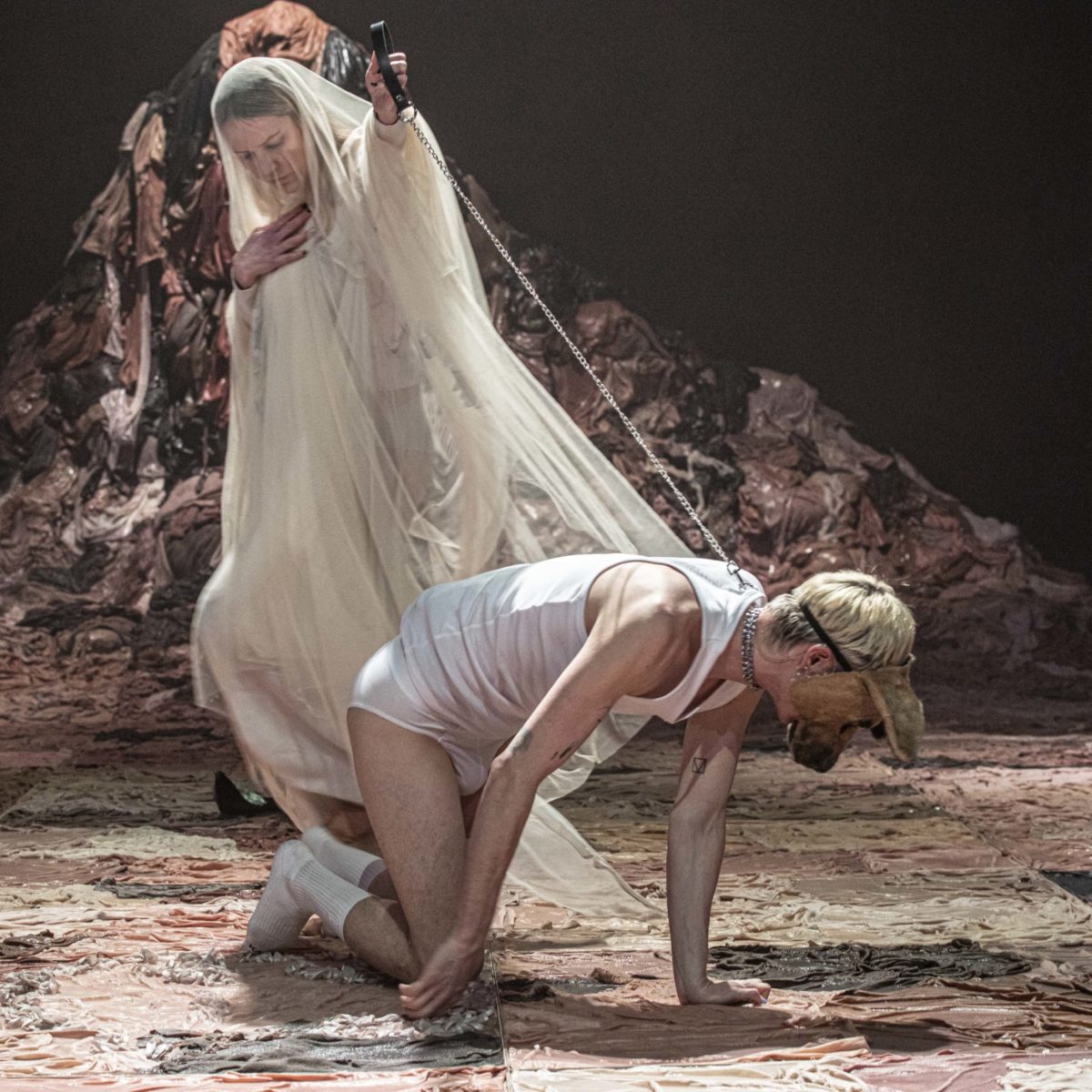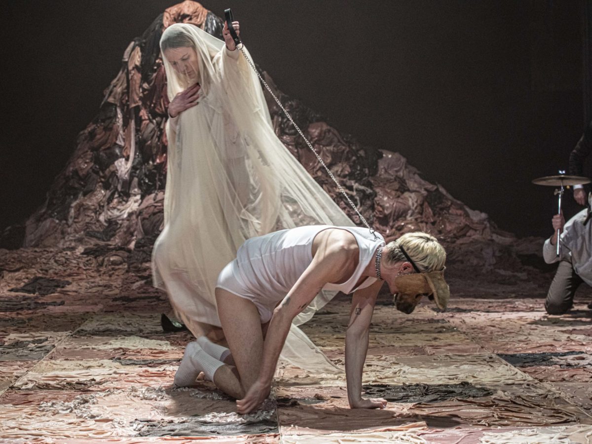Sur scène, une scénographie imposante faite de résine et de vêtements empilés donne l’impression d’un monticule gluant, obscène et somptueux. Les comédien.ne.s et musicien.ne.s évoluent sur ce champ de bataille visqueux, la plupart du temps masqués de collants ou de têtes de chien. Projeté sur un écran suspendu au centre, le verbatim d’une des ignobles vidéos disponibles sur le site French Bukkake (aujourd’hui fermé) défile tout au long du spectacle. Ce « film porno » n’est ni plus ni moins qu’un viol collectif organisé, fruit de mensonges, d’abus et de pressions psychologiques auprès de la victime, « Daphné ». Au jeu et aux projections s’ajoute donc la musique, qui a par ailleurs davantage de place que le théâtre dans cette mise en scène à l’esthétique prolixe.
