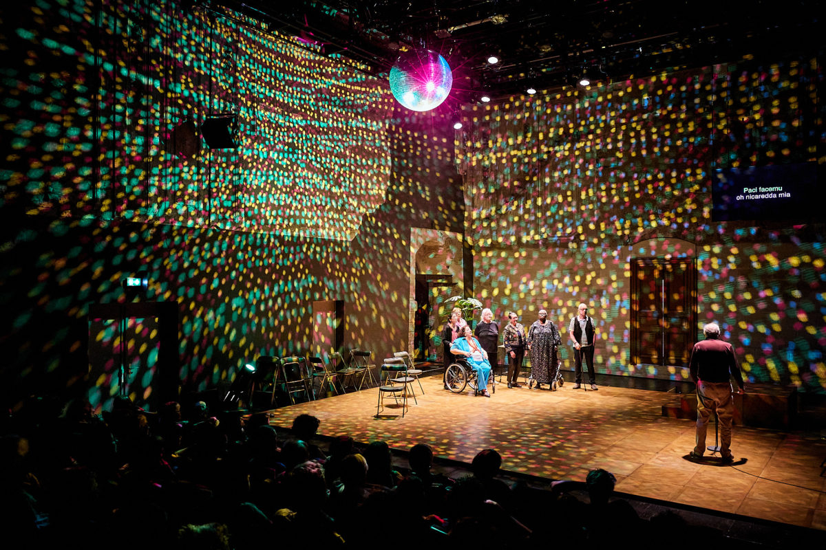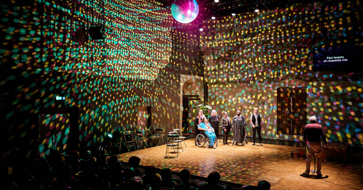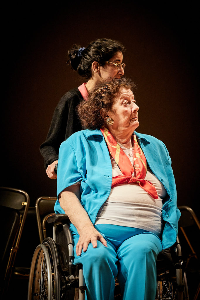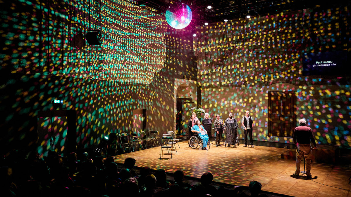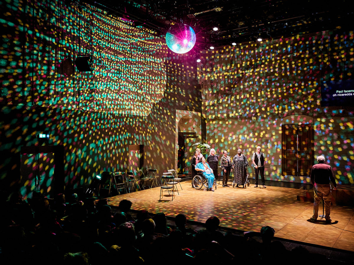 Dans une salle de bal un peu désuète, cannes et déambulateurs arrivent doucement sur scène pour raconter ce que cela signifie d’être amoureux et d’avoir des rapports sexuels passé la fleur de l’âge. En préambule, est diffusé sur une télé le témoignage d’Anne, vidéo enregistrée au cas où elle mourrait et ne pourrait plus être sur scène. Puis, l’urne funéraire de George, autre défunt de la joyeuse troupe, est placée sur un podium. Le public est par ailleurs averti, il faut rester calme si un.e des comédien.ne.s mourraient sur scène, c’est la vie. Loin d’être glauques, tous ces retraités s’étaient promis de continuer même si l’un.e d’elleux décédaient. Chose promise et chose due dans la joie et la nostalgie.