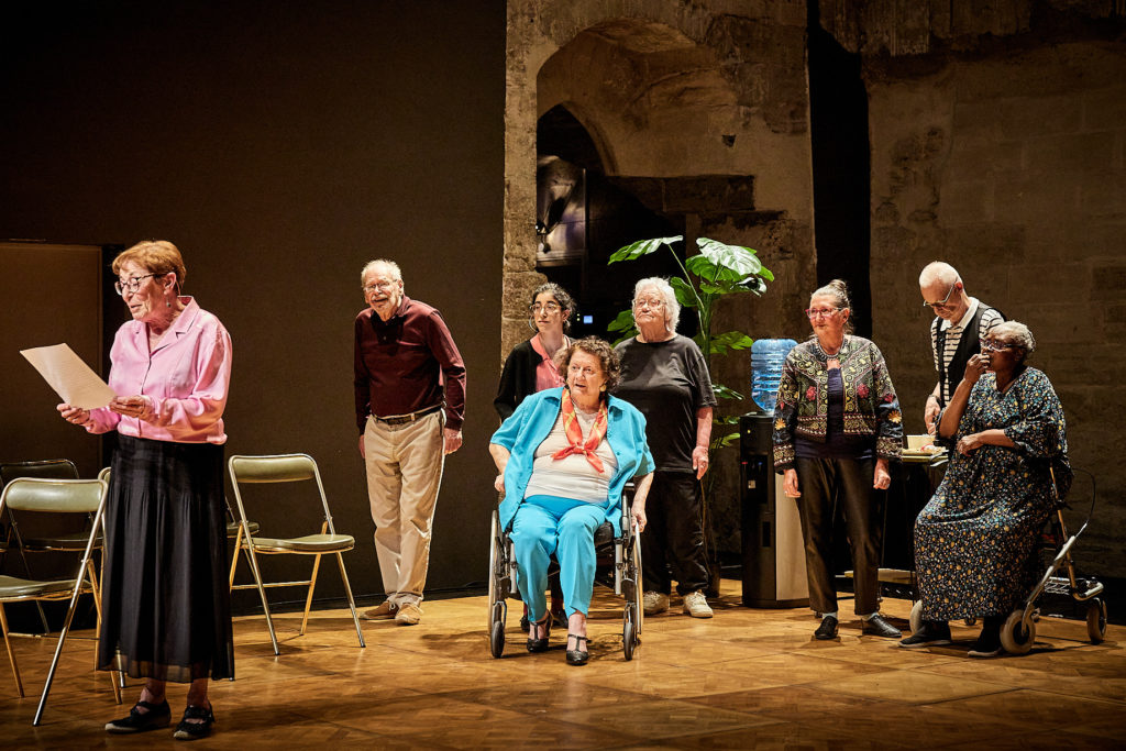 Créé au Théâtre National Wallonie-Bruxelles puis présenté au Festival d’Avignon en 2024, cette « pièce à obsolescence relative » met en scène six vieilles et vieux qui parlent des relations amoureuses et sexuelles du troisième âge. La troupe en peau de chagrin s’égrène au fil des saisons, le générique l’indique : « en alternance et selon leur longévité ». Au départ iels étaient huit, plus que six maintenant, accompagné.e.s sur scène d’une aide-soignante et de Mohamed El Khatib lui-même. La joyeuse troupe ridée était de passage au Théâtre du Rond-Point.