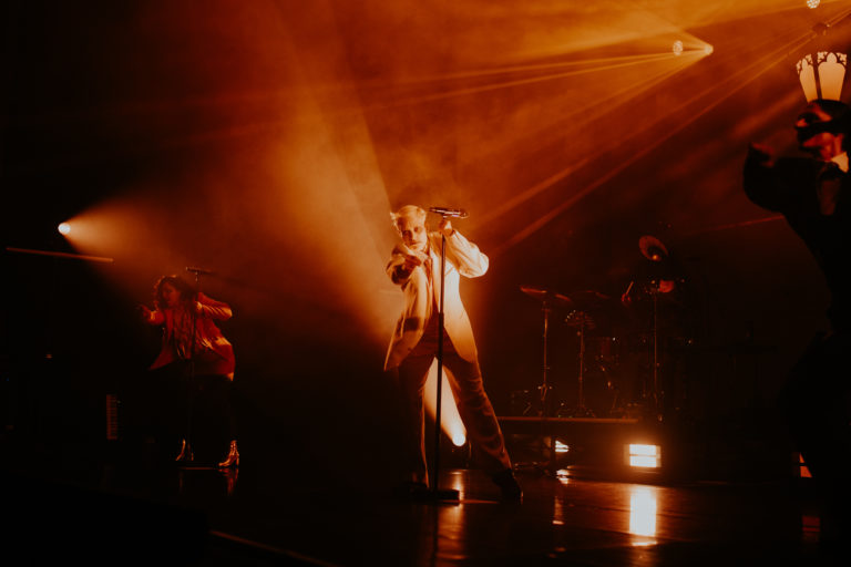 Un breuvage cosmique en main, l’attente du début du show s’est joué au coude à coude au bar et voilà que les lumières s’éteignent. Pas toutes, l’une d’entre elles, un lampadaire vacille sur scène. Cette dernière se pare d’un voile de brume, aussi inquiétant qu’excitant. L’ombre de l’Exorciste plane-t-elle? L’affiche culte trône dans les esprits. Voilà que les hôte.sses de la soirée entrent en scène. Les tenues hallucinantes sont à l’image de la grandeur du spectacle. Alors que les premières notes de « What they Call Us » résonnent, les musicien.nes dévoilent leur parures : un body aux symboles de planètes, un joueur de synthé qui porte un chapeau nuage sur la tête, à la batterie un chapeau en forme d’auréoles pointe le bout de nez. Et puis vient l’iconoclaste 8ème passager.ère (ou plutôt 6ème ici) Dreijer, son costume blanc et ses cheveux coiffés en forme de cornes. Il n’en faut pas plus pour être entièrement envoûter. La promesse est faite d’un périple indomptable dont le souvenir ne s’effacera pas. La set list se poursuit avec « New Ustensils » extrait de « Radical Romantics », dernier album de la formation. Alors que les 3 premiers morceaux servent à installer le décors et promettent un décollage sans concession, les basses et percussions frappent forts. Elles se déclinent telle une annonce. Faites sonner trompettes et batteries, l’instant est important. A la suite de quoi Dreijer salue enfin son public.