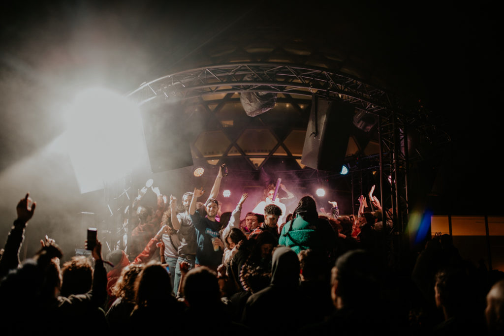 S’il fallait retenir une performance de la soirée c’est bien et sans surprise celle de Bagarre ! Le groupe devait se produire deux fois ce soir-là sur la scène extérieur Rodin 360 qui porte son nom parce qu’elle est ronde et que le public se place donc tout autour d’elle (un nom bien trouvé vous en conviendrez). Seulement voilà, le temps immonde de cette fin du mois de mars ne permet à la formation de ne livrer qu’une seule performance ce soir. Tant pis pour le Joe Goldberg en nous, qui aurait bien fait le stalker en venant assister à deux performances, il faudra se contenter d’un show et de tout commenter en voix off. Si le groupe est talentueux sur album, il sait toujours se magnifier en live et créer une véritable fête lorsqu’il se produit. Avec de bonnes grosses bourrasque dans la face, le plaisir reste pourtant intact (les cheveux non par contre). Les morceaux se succèdent portés par nos compères qui s’approprient pleinement l’espace. « KABYLIFORNIE », « Béton Armée », « Diamant », « Le Gouffre » sont autant de raison de danser contre vents et marées (mais pas marées voilà c’est le 92 ici bien que la Seine puisse donner ce petit côté aquatique). Avec de grosses doudounes colorées, des lunettes de soleil et des tenues aussi décontractées que la flashies, la bande s’en donne à coeur joie, fait s’asseoir et sauter l’assistance, reprend « Tonton du bled » du 113 et tourne sur le plot central en hauteur avec la précision scénique qu’on lui connait. Par deux fois, elle invite même le public à la rejoindre sur scène, qui répond à l’invitation en trop grande masse. Peut-être croyant, avec les températures, qu’un iceberg a heurté la Seine musicale et que la scène 360 est le radeau de de Rose. Le moment se conclut sur « AU REVOIR A VOUS » bien trop tôt au goût de tout le monde et quelques confettis s’envolent à toute allure dans les airs emportés par le vent.