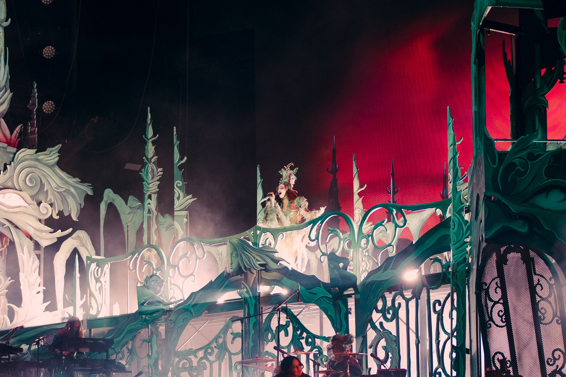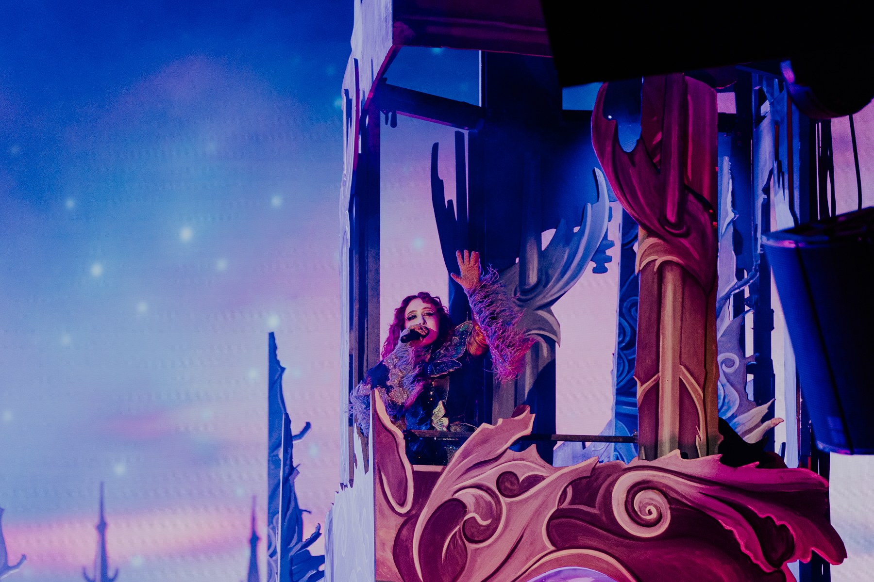 Il est 21h45 quand la princesse du Midwest déploie ses ailes… enfin, 21h55, mais on ne lui en tiendra pas rigueur : le retard, ça arrive aux meilleur·es. Et puis, elle apparaît. La scène s’ouvre comme un livre de conte : en château de conte de fées, les écrans projettent un ciel étoilé, des galaxies, des pégases. Dans le public, un cri fuse : « C’est Disneyland, en fait ! » (ok, j’avoue c’était moi).
