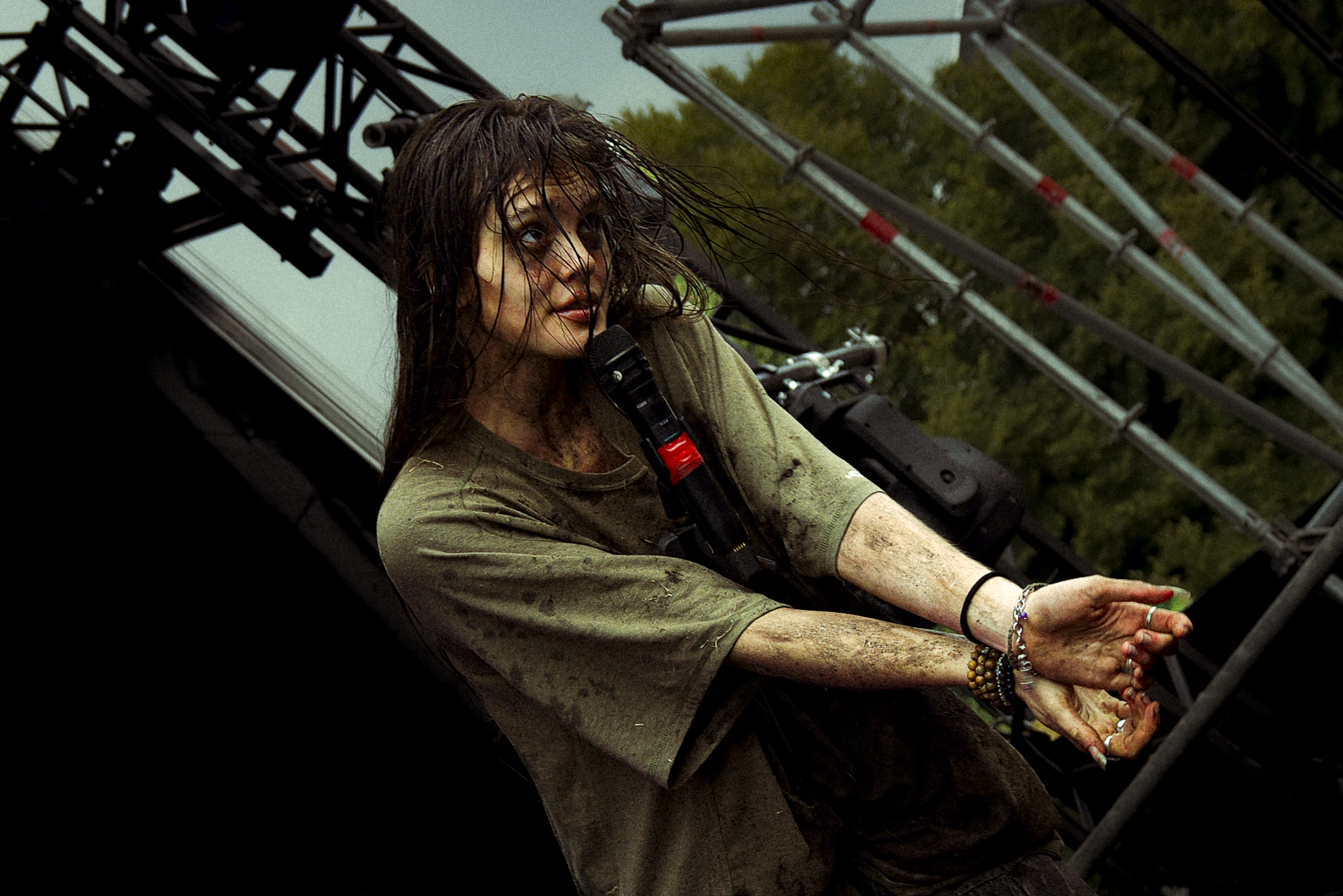 Seule face à la pluie, ses gestuels, sauvages, violentes, révoltées se vivent comme un cri militant pour l’autonomisation de la femme. Puissante, elle y prend les pleins pouvoirs osant les mélanges des genres. De sa pop hantée, aux accents gothiques, ressort l’âme de ce qu’Ethel Cain sait parfaitement évoquer. D’ailleurs ici et en aparté, le clash Ethel vs Lana déchire la rédaction. Dans le paysage Sofia, loin de la pop mélancolique, lui préfère les rythmiques endiablée, celles d’une guerrière et martèle à coup de batterie ses messages. « Tout le monde soutient les femmes jusqu’à ce qu’elle fasse mieux que vous » chante la musicienne sur le titre « Everybody supports woman » grand absent de la setlist ce soir. Elle fait pourtant bien mieux que la plupart de la scène actuelle que se soit sous nos yeux ou en studio. La pluie s’intensifie, nos émotion tout autant. « The Doll People » permet au set de s’offrir une montée en puissance redoutable. En bout de course, la musicienne s’offre un bain de foule et le vit comme un exutoire. Un tout dernier titre résonne alors comme une promesse qu’on ne pourra contredire : « I looked the future in the eyes, It’s Mine ».