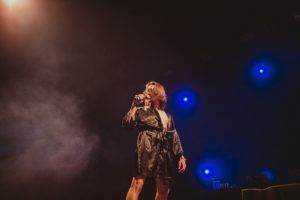 C’est sur ces paroles que Marc Rebillet fait son entrée sur la scène Dome. L’artiste, habillé simplement d’un caleçon et d’un peignoir est particulièrement remonté contre son pays d’origine. Le texan est contre l’interdiction récente du droit à l’avortement aux USA et le fait savoir avec un set revendicateur. Dans l’audience, nombreux sont ceux à s’être apprêtés comme le musicien : les peignoirs sont nombreux au premier rang.